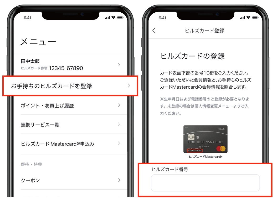 の下部「ヒルズカードを登録する」もしくはメニューから「お手持ちのヒルズカードを登録」をタップし、ヒルズカード番号(カード表面下部の10桁)を入力
